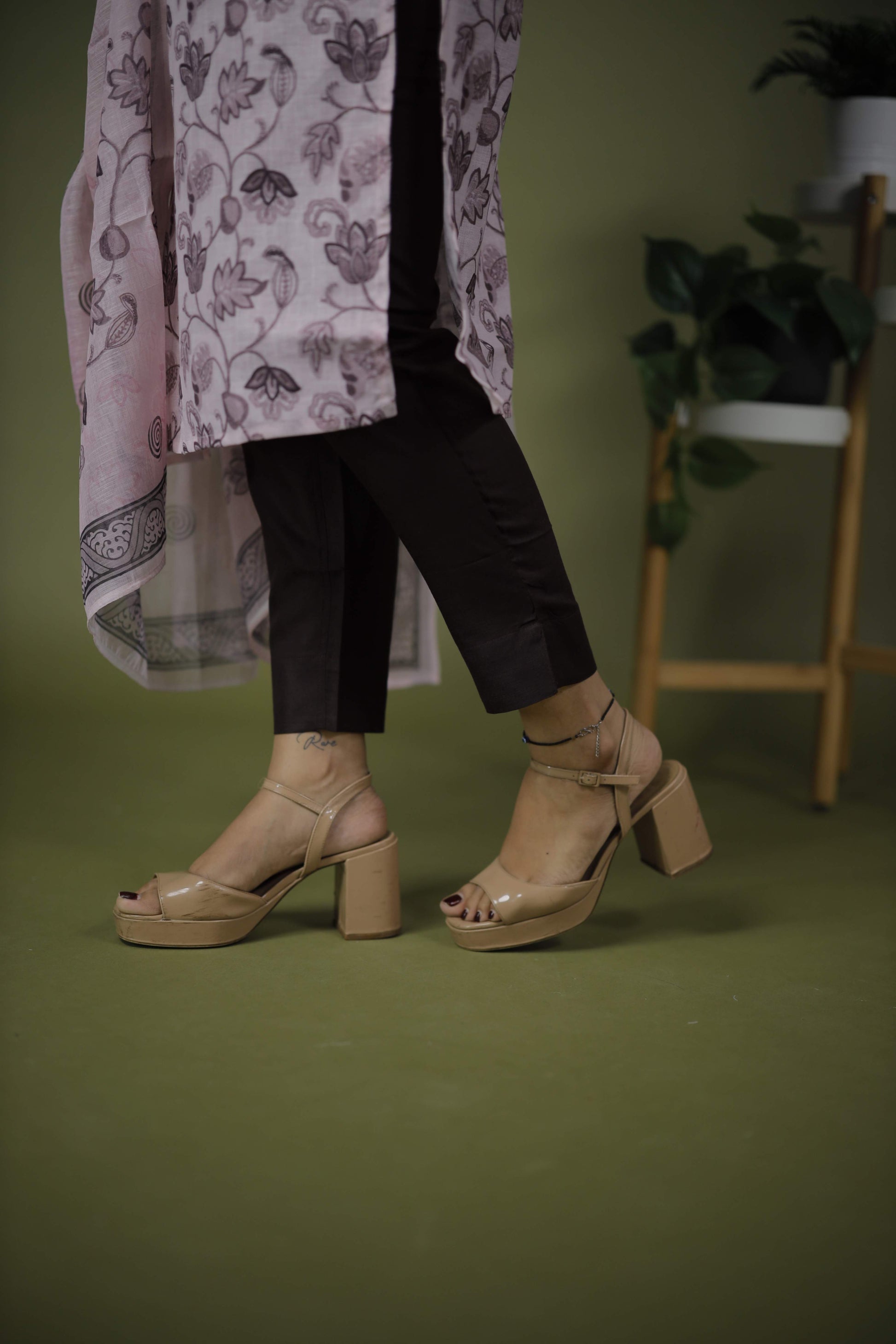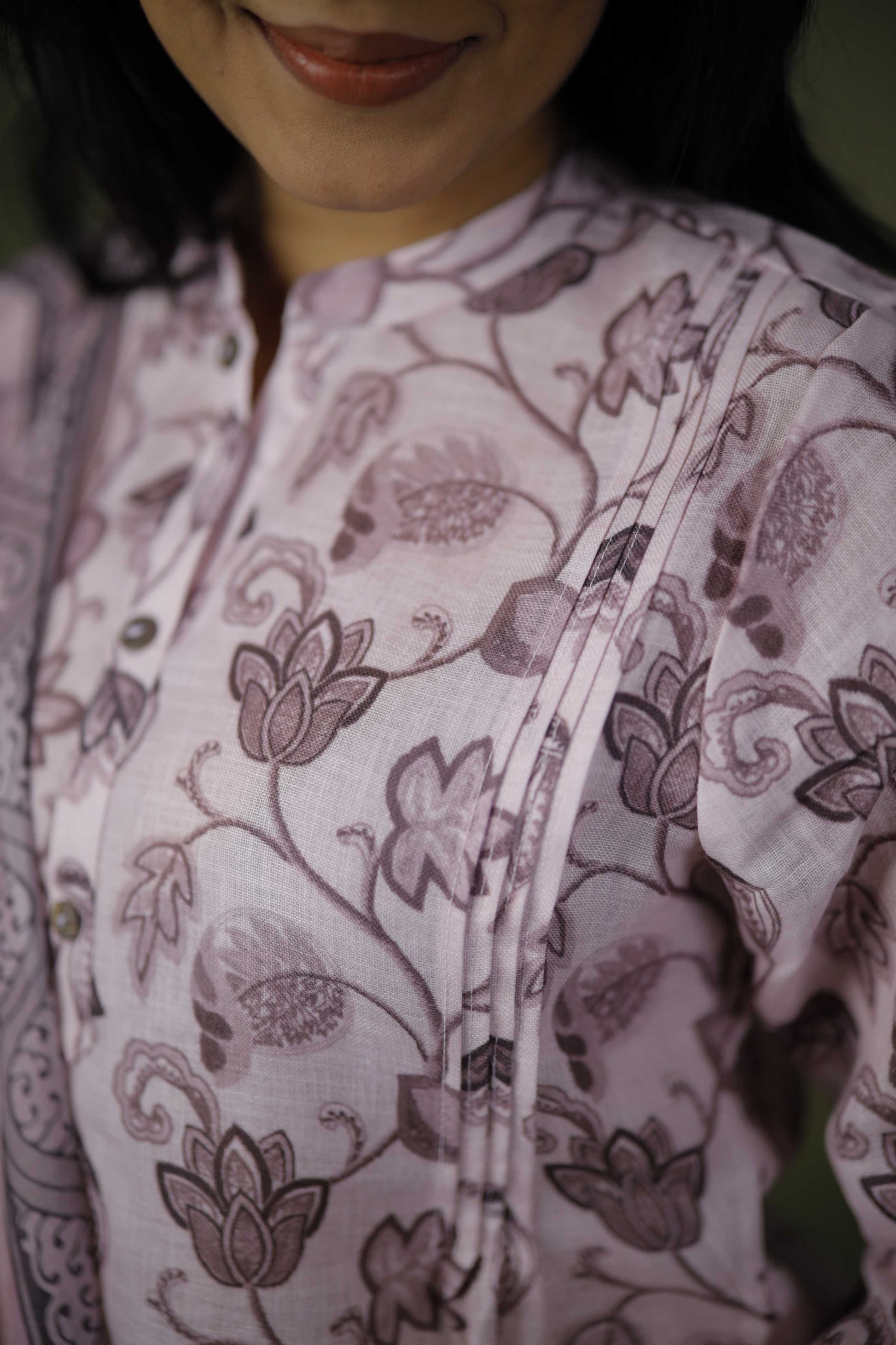 Kurta: Pink floral printed design with a mandarin collar and buttoned placket, featuring three-quarter sleeves.