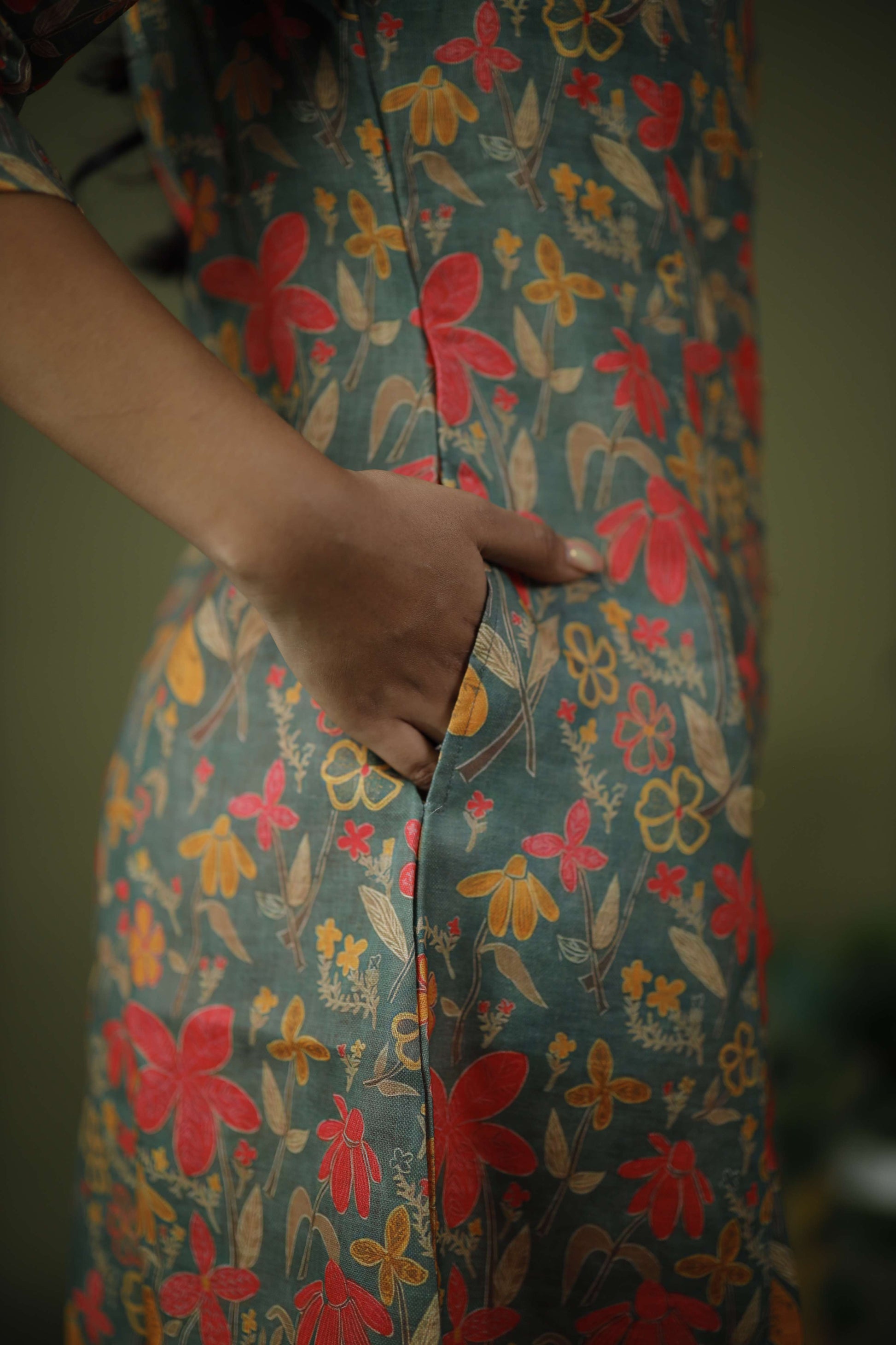Color: Olive green base with vibrant floral prints in red, yellow and orange hues.